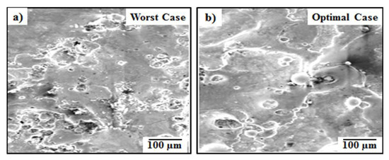 Additionally, SEM analysis was performed to validate the optimal conditions (Table 18; A1B3C1D1: dielectric fluid: distilled water, peak current: 9 A, pulse-on-time: 50 µs, and electrode material: graphite) of CRITIC and PCA-utility method with worse conditions (refer Exp. No. 18 of Table 6; A2B3C3D2: dielectric fluid: kerosene, peak current: 9 A, pulse-on-time: 100 µs, and electrode material: copper) in terms of surface integrity on the machined surface. The worst condition was decided based on the lowest values obtained for multiple S/N ratios of Table 15 (refer Exp. No. 18). Both worst and optimal conditions SEM images are shown in Figure 6a,b.