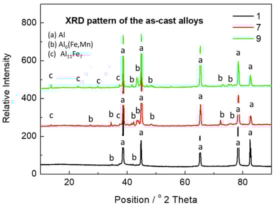 The phase composition of all alloys is shown in XRD patterns in Figure 1. In Alloy 1, the aluminum matrix with a negligible amount of a minor Al6(Fe,Mn) phase was detected. In Alloys 7 and 9, the presence of Al6(Fe,Mn) and Al11Fe7 phases was observed in addition to the aluminum matrix. Minor elements are probably dissolved in the major phases.