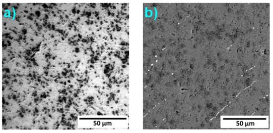 The black spots in Figure 2a, which appear as dark grey spots in Figure 2b, might be formed by Si that originates from the impurities in the initial Al. More probably, these particles are SiC abrasive particles extracted from the grinding paper. This alloy has extremely low hardness, and hence, it is impossible to preclude this contamination during the sample preparation. The minor intermetallic phases are visible as the bright elongated particles in Figure 2b.