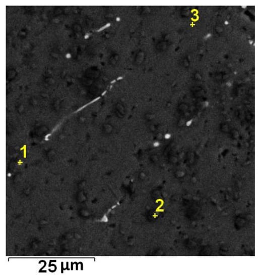 The composition corresponding to the bright particles is shown as Spectrum 1 in Table 2. The localization of point EDS analyses is shown in Figure 3. The size of the bright particles is too small, and, therefore, the point EDS spectra also contain signals from the Al matrix. It can be suggested that the minor phase is Al6(Mn,Fe), which is in agreement with the XRD results shown in Figure 1.