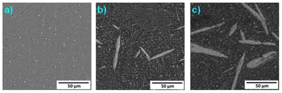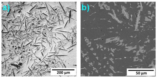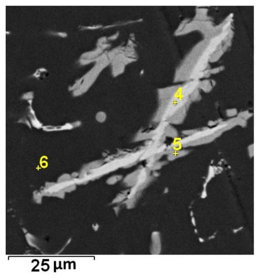The total content of Mn and Fe in the needles in Alloy 9 was estimated to be about 35 wt %; in this case, see also Table 4. These particles are formed by the Al6(Mn,Fe) phase. The fine particles occupying the interdendritic spaces are rich in iron and might be formed by the Al11Fe7 phase. However, this morphology is typical for the Al13Fe4 phase []. The fact that this phase was not detected by the XRD given in Figure 1 may be caused by the very small size of the particles and a content lower than 5 wt %.