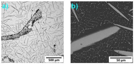 The microstructure of Alloy 7 is formed by the Al matrix, minor Si-rich particles, and needles rich in Mn and Fe. The needles have a core with a higher content of alloying elements, as can be seen in Figure 4b and Figure 5.