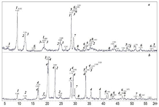 XRD pattern of the original concentrate (a) and of the concentrate mixture with ammonium sulfate (b). Numbers indicate reflexes: 1—talc; 2—lizardite; 3—clinochlore; 4—mascagnite; 5—chalcopyrite; 6—pyrrhotite; 7—pentlandite; 8—magnetite.
