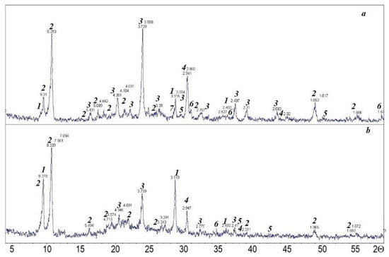 XRD pattern of the clinker after roasting at 450 °C (a) and of the leaching residue (b). Numbers indicate reflexes: 1—talc; 2—coquimbite; 3—mohrite; 4—pyrrhotite; 5—pentlandite; 6—magnetite; 7—nickel sulfate.