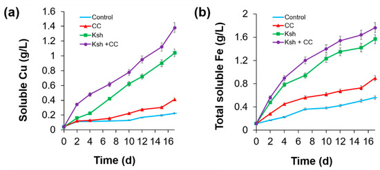 Bioleaching of Cu (a) and Fe (b) from chalcopyrite by iron- and sulfur-oxidizing bacteria At. ferrooxidans Ksh and iron-oxidizing L. ferriphilum CC.