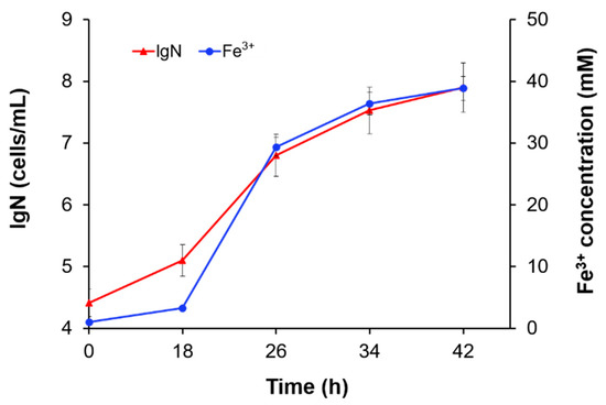 Dynamics of growth and iron oxidation by L. ferriphilum CC. Cells were grown in Mackintosh (MAC) medium with 70 mM Fe2+ and an initial pH of 2 at 37 °C and 200 rpm. N represents cell number (cells/mL).