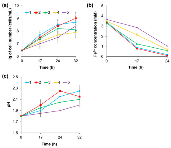 Effect of Fe3+ on dynamics of growth of L. ferriphilum CC (a), oxidation of Fe2+ (b) and pH changes (c) at concentrations: 2 mM (1), 20 mM (2), 50 mM (3), 75 mM (4) and 100 mM Fe3+ (5).