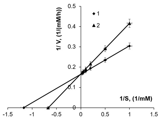 Determination of Km according to Lineweaver–Burk; 1—in the absence of Fe3+, 2—in the presence of 50 mM Fe3+.