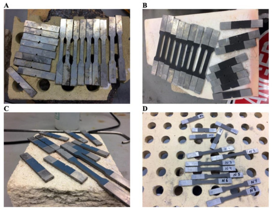 (A) Digital image of the thermally postprocessed HPDC A365 reference specimens procured during the current research effort. (B) Digital photo of the thermally postprocessed Cu CGDS coated HPDC A 365 substrate system. (C) Digital photo of the thermally postprocessed Ti CGDS coated HPDC A 365 substrate system. (D) Digital image of the thermally postprocessed Ni CGDS coated HPDC A 365 substrate system. Note that the same dimensional reference provided in Figure 1 holds here as well.