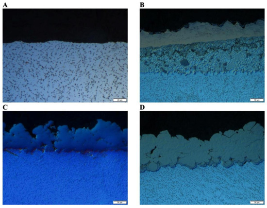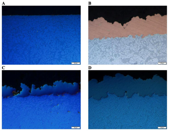 (A) Optical micrograph of the as-cast A365 HPDC. (B) Optical micrograph of the copper CGDS processed A365 HPDC sample. (C) Optical micrograph of the titanium CGDS processed A365 HPDC sample. (D) Optical micrograph of the nickel CGDS processed A365 HPDC sample. Black portions within the micrographs capture the mounting material. Various degrees of subsurface modification are observable within each micrograph provided. The scale bar embedded within each micrograph presented represents 50 µm.
