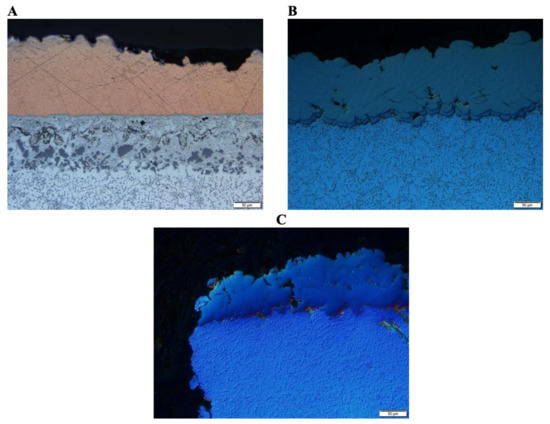 As for Figure 3B, a much less pronounced near-surface and subsurface microstructurally dendritic grain-scale texture was present within the copper-coated A365 substrate compared with the microstructure presented in Figure 3A. In contrast, the microstructural texture affiliated with the nickel coated A365 substrate, in Figure 3D, was more pronounced than that of the copper specimen in Figure 3B and less gradually transitional than the microstructural texture found in Figure 3A. At the same time, it is also interesting to note that the copper samples resulted in the HPDC A365 substrate material, near the coated surface and coating-substrate interface, hydrodynamically flowing within the coating, and vice versa, via Kelvin-Helmholtz interfacial instabilities [30]. Nickel and titanium samples, however, did not achieve the same degree of interfacial intermixing between the substrate and deposited material.