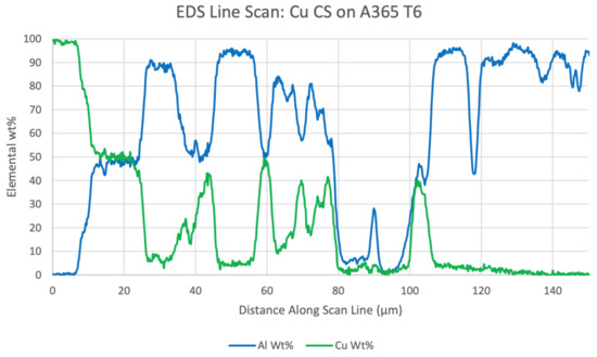 Presentation of the EDS line scan recorded for the Cu CGDS coated HPDC A365 substrate system in the thermally postprocessed condition.