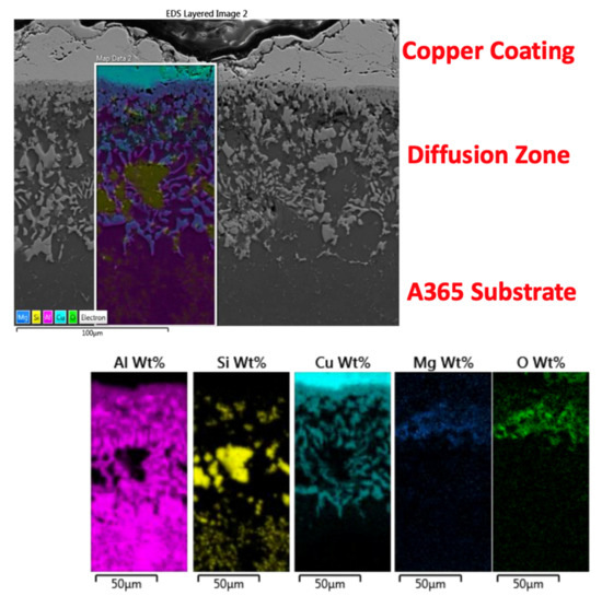 Copper cold spray coatings consolidated upon HPDC A365 underwent a T6 treatment cycle. The first layer is composed of the copper coating, the next distinct layer is the diffusion zone, and the final layer is the A365 substrate. EDS mapping shows the contents of each of these regions. The copper coating is dense with little to no porosity. The high impact of cold spray closed all gaps and provided an excellent coating method in this regard. Black streaks can be seen towards the top of the image, and these are bands of copper oxide.