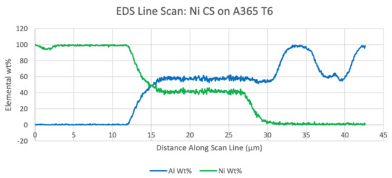 Presentation of the EDS line scan recorded for the Ni CGDS coated HPDC A365 substrate system in the thermally postprocessed condition.