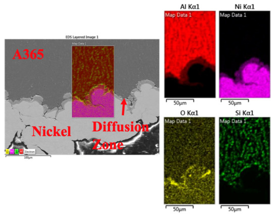 Presentation of the EDS mapping recorded for the Ni CGDS coated HPDC A365 substrate system in the thermally postprocessed condition.