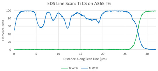 Titanium results from EDS show no significant diffusion into the surface of the aluminum substrate. Figure 10 shows the line scans of aluminum and titanium against distance along with the scan. In this figure, the titanium coating began on the right-hand side and moved leftwards. An insignificant amount of titanium can be found in the aluminum substrate due to the electron beam’s probe size in EDS analysis. Dips in aluminum content along the scan are due to formations of silicon phases in the bulk of the sample.