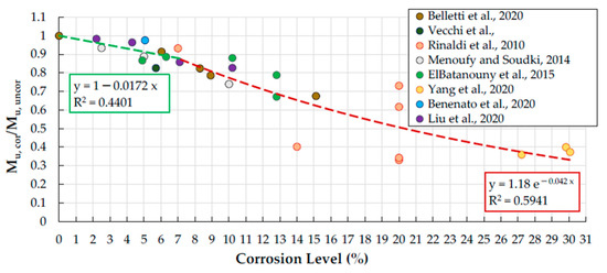 - An initial attempt has been made to relate the residual ultimate bending moment ratio—the ratio of the bending moment strength of a corroded beam (Mu,corr) to an uncorroded beam (Mu,0)—to strands’ mass loss (%) as caused by corrosion. Even if a clear trend in flexural strength decay can be observed, due to the lack of sufficient and homogenous experimental data, the proposed relationship is not statistically representative.