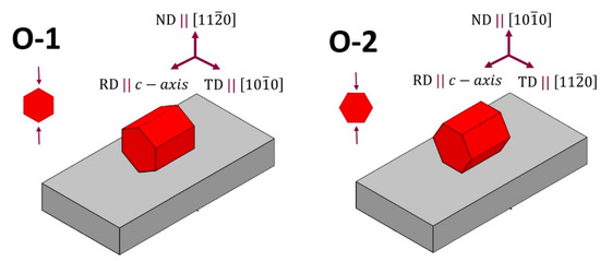 The single crystals of commercially pure magnesium (min. 99.95%) were fabricated by crystal growth using the Bridgman method in a vertical configuration. To manufacture monocrystalline rolling samples with their geometric axes coinciding with specific crystallographic directions, each grown single crystal was oriented by means of the Laue X-ray back diffraction method [15], then, slabs with dimensions of 40 mm × 20 mm × 6 mm were cut by electrical discharge machining (EDM). Figure 1 shows the schemes of the rolling samples and their orientation relationship with the crystal directions. The c-axis of the crystals were aligned parallel to the rolling direction in both orientations. In the sample labeled “orientation 1” (O-1), the normal direction (ND) was aligned parallel to crystal direction and the transversal direction (TD) corresponds to . In the sample of “orientation 2” (O-2), the normal direction (ND) was aligned parallel to crystal direction and the transversal direction (TD) corresponds to . The misalignment between the crystallographic directions and the specimen axes was less than 0.5°.