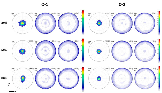 With increasing strain at of reduction thickness, in the O-1 texture, the basal texture intensity became strengthened and reached a value of 19.4. Meanwhile, (0002) PF of O-2 shows an intensity of 26. The increment in the intensity is slightly higher for O-2 than for O-1 with respect to the PF at 30%. Regarding the and pole figures, the same components described at 30% can also be observed at 50%.