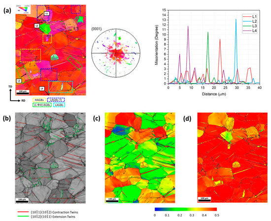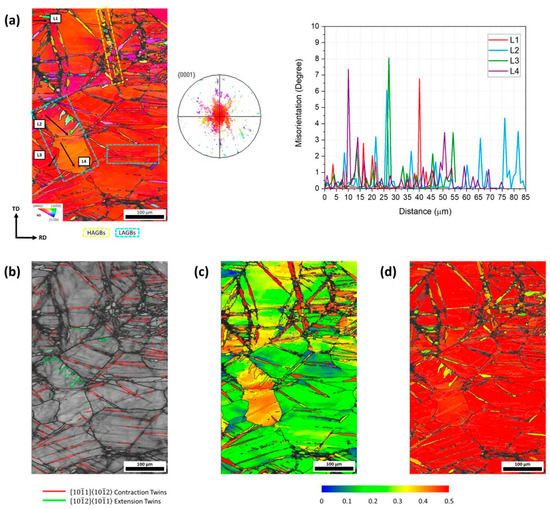 Electron Backscatter Diffraction (EBSD) results obtained from an O-1 specimen at 50% of thickness reduction: (a) EBSD map in inverse pole figure (IPF) coloring relative to normal direction (ND), corresponding scattered data (0002) PF and misorientation profiles, (b) twin boundary misorientation map, (c) Schmid Factor map for slip system, (d) Schmid Factor map for slip system.