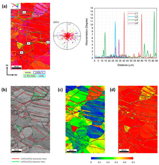 Figure 5 shows the EBSD results of the interrupted rolling at 30% of reduction of O-1. The original indexing for the mapping was 87% and was improved to 97% by noise reduction, and the map size consists of a grid of 818 × 1063 points. The area fraction of extension twins was 0.019 and 0.048 for contraction twins. In the orientation map (Figure 5a), yellow squares point to high-angle grain boundaries (HAGBs), and these belong to grains that recrystallize at the triple junctions (TJ). Blue boxes enclose low-angle grain boundaries that bulged at the triple junctions (LAGBs-TJ). The nucleation of new grains at the triple junction could be related to the discontinuous dynamic recrystallization (DDRX) mechanism occurrence [22], but it is not the purpose of this paper to address this analysis. Meanwhile, green boxes point out zones where it is possible to observe the transition from a LAGB to HAGB (gray-grain boundary to black-grain boundary), but not at the triple junctions. Cyan rectangles enclose LAGBs that completely cross an extension twin, indicating that the dislocations can slip into the parent grain, completely cross the twin, and move onto the parent grain again.