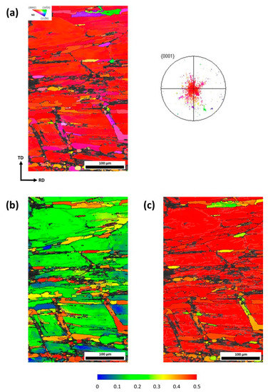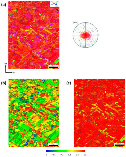 Electron Backscatter Diffraction (EBSD) results obtained from an O-1 specimen at 80% of thickness reduction: (a) EBSD map in inverse pole figure (IPF) coloring relative to normal direction (ND) and corresponding scattered data (0002) PF, (b) Schmid Factor map for slip system, (c) Schmid Factor map for slip system.