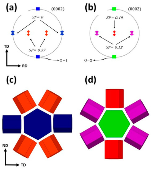 (0002) calculated PF showing the initial orientations (a) O-1 and (b) O-2, as well as their corresponding extension twin variants. Schematic representation of twin variants for (c) O-1 and (d) O-2.
