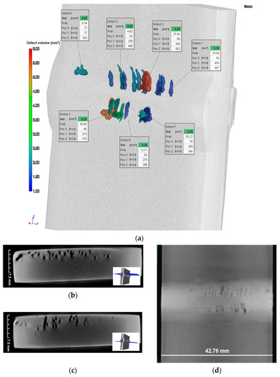 CT results for specimen 991-FM-2 (type-NC-4): (a) defect evaluation; (b,c) tomograms of the cross-section of the weld bead and (d) some along X-rays of the joint.