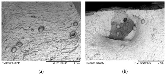 Scanning electron microscopy (SEM) of defects in the fracture zone of the specimen 766-FM-C: (a) inclusions in the propagation area; (b) large void in the crack initiation site.