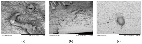 SEM of defects in the fracture zone of the specimen 766-FM2: (a) inclusions; (b) worm holes and (c) void in the propagation area.