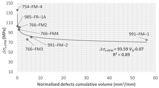 Figure 17 shows the values of ΔσeΦTM versus their VN. The experimental data were interpolated (R2 = 0.89) by a power relationship, which highlights the sharp decline in ΔσeΦTM value from 136 to 81 MPa for a VN increments from 0.01 to 6.1 mm3/mm. A fatigue strength decrement equal to about –55% is reached for VN increment equal to 56.18 mm3/mm.