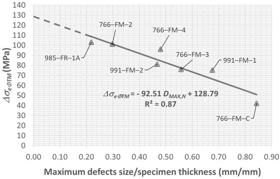 Figure 18 shows the values of ΔσeΦTM vs. DMAX,N. The experimental data were interpolated (R2 = 0.87) by a linear relationship which highlights the reduction of ΔσeΦTM from 103 to 42 MPa for a DMAX increment from 0.22 to 0.86 mm. The value of ΔσeΦTM, obtained by the intersection of this straight line with the ordinate axis, is equal to about 129 MPa and corresponds to a specimen without defect. The predicted value is close to the values of ΔσeΦTM for type-C welded joints (Table 6). A fatigue strength decrement equal to about –55% is reached for the DMAX,N increment equal to 0.86 mm.