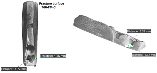 The specimen that exhibited the lowest fatigue strength (42 MPa) was 766-FM-C. The fracture surface was also analyzed by CT (Figure 19), which allowed the measurement of the defect causing crack initiation (see also Figure 11). The geometry of the defect, as shown in four different measurements, was correctly estimated by in situ X-ray radiography and can be classified as slag inclusion, having a different density from the steel constituting the specimen.
