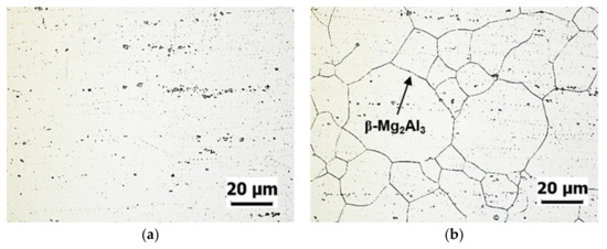 The microstructure of the extruded AlMg6 alloy with the specimen of (a) E and (b) ES etched by phosphoric acid etchant. The phase with black line in (b) represents the β-Mg2Al3 precipitation.