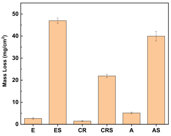 Nitric acid mass loss test (NAMLT) results of E, ES, CR, CRS, A, and AS.