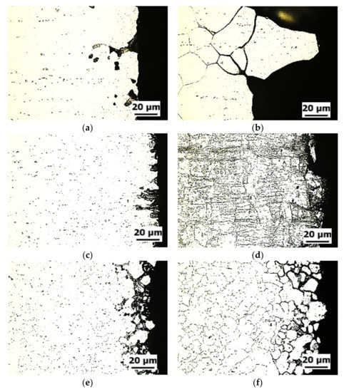 IGC behavior can be explained by several factors, such as the grain size, grain boundary types, and the distribution of anodic precipitation, etc. [10]. How the grain size affects the intergranular corrosion behavior has not been clearly understood yet. Several studies have stated that the microstructure with large grain size has less susceptibility to intergranular corrosion [12,13].