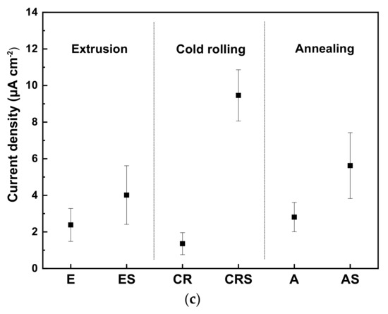 Electrochemical property test of Al-6Mg alloy for each manufacturing process. (a) Potentiodynamic polarization curve; (b) corrosion potential (c); current density.