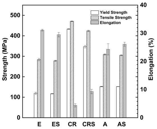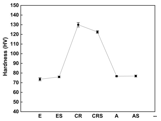 Figure 7 shows that the variation of Vickers hardness with specimen E, ES, CR, CRS, A, and AS. According to the figure below, the hardness results slightly increase in both extruded and annealed specimens during the sensitization heat treatment explained by the precipitation hardening effect. On the contrary, the hardness results of the cold-rolled specimen show different trends because the age softening effect occurs when the specimen is heated in 200 °C for 45 min. As can be seen in Figure 5d, anodic precipitations form on the grain boundary indeed during the sensitization heat treatment, but the age softening effect dominates in the specimen CR so that the hardness results decrease.
