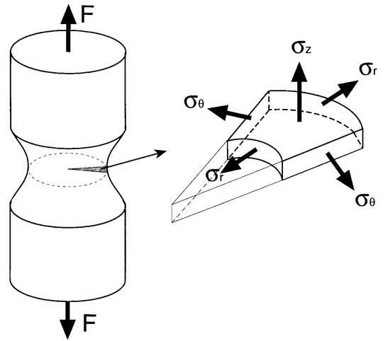 Therefore, the stresses σr, σθ, and σz acting on the net section of each tested wire were numerically obtained by the finite element method, with special attention to the value and distribution of the hoop stress σθ along the net wire radius just at the fracture instant. Moreover, these variables permit one to establish a fracture criterion as a function of the distortional component of the strain density in agreement with a critical value of the Von Mises effective (equivalent) stress.