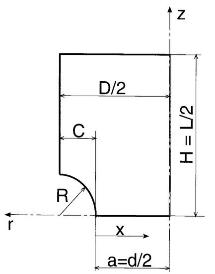 In the described geometries, R is the notch radius, C the notch depth, and D the external diameter of the axisymmetric specimen.