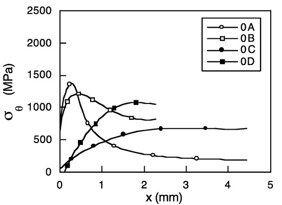 Figure 9 shows the dimensions of the notched geometries. Figure 10, Figure 11 and Figure 12 plot the hoop stress σθ for the initial hot-rolled bar (steel A0), for a steel with an intermediate accumulated plastic strain degree (steel A3), and for the final commercial product (steel A6). In these graphs, the different notches for each wire are represented, where x is the distance from the bottom of each notch to the longitudinal axis of the wire (cf. Figure 9).