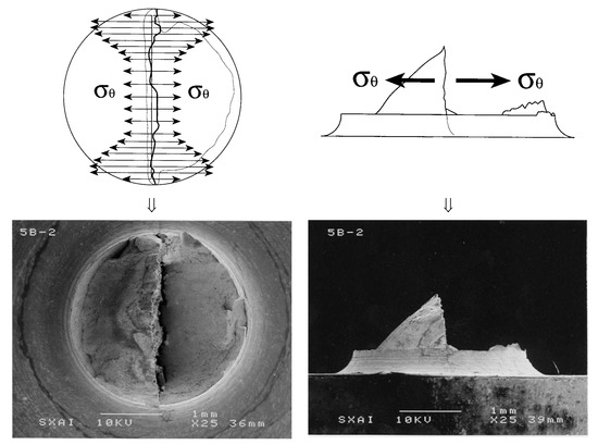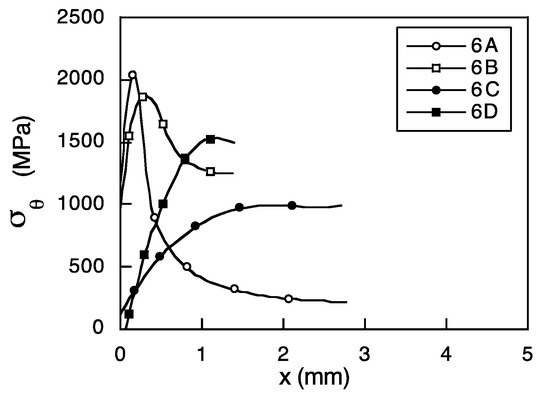 Figure 14 shows one representative case of the anisotropic fracture behavior: the sample named 5B (wire of the fifth cold-drawing step and with a notch type B—maximum level of triaxiality). The hoop stress σθ has a radial distribution (profile) such as that shown in the Figure. Such a distribution, whose maximum net value corresponds to the notch type A and B, maintains the same shape for every value of the annular coordinate θ in the transverse net section, and reaches a critical value just at the moment associated with the fracture initiation and full propagation.