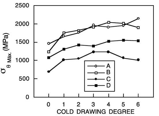 Figure 13 shows the evolution on maximum values that presents the hoop stress σθ for all cold-drawing degrees and notch types studied in this work. This plot shows that the maximum values in the hoop stress σθmax are for the specimens with small notch radius (sharp geometries A and B) in independence of the considered cold-drawing degree. The minimum values of the hoop stress are for those samples with high notch radius (blunt geometries C and D).