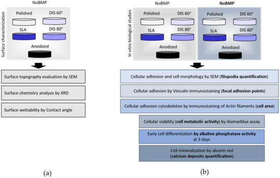 Schematic design of materials and methods of this research study. (a) surface characterization and (b) biological characterization. Abbreviations: Scanning electron microscopy (SEM), X-ray diffraction (XRD), Alkaline Phosphatase (ALP), NoBMP (without BMP-2 protein), BMP (with BMP-2 protein), DIS 60° (Ti6Al4V irradiated using argon ions and 60 incidence angle), DIS 80° (Ti6Al4V irradiated using argon ions and 80 incidence angle), Sandblasted and acid etched Ti6Al4V (SLA), Acid etched and anodized Ti6Al4V (Anodized).