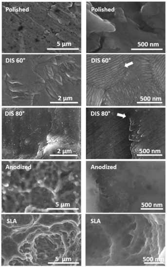 On the other hand, we did observe a reduction of CA values on DIS samples compared to polished surfaces. DIS surfaces were slightly more hydrophilic than polished Ti even though no statistical differences were detected (p > 0.05). It should be noticed that SLA (40.83 ± 3.42°) and Anodized (20.57 ± 0.9°) showed statistical differences with polished and DIS-treated samples. Therefore, SLA and Anodized samples were more hydrophilic surfaces compared to polished or DIS-treated samples which had similar wettability, polished (79.43 ± 3.44°), DIS 60° (65.33 ± 3.89°) and DIS 80° (71.33 ± 1.27°) (Figure 4).