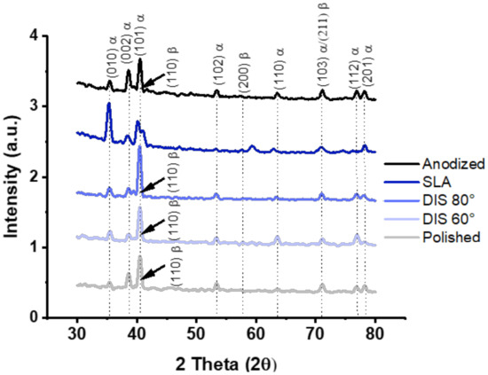 Our samples are (α + β) titanium alloy that contains α stabilizer element aluminum and β stabilizer element vanadium. α phase could be observed using (100), (002) and (101) α peaks. β phase could be observed at (110) β peaks (black arrow). We did not observe any major changes in the α and β phase of the modified DIS Ti samples, which confirms the similar surface crystalline structure of Ti6Al4V modified samples as polished Ti (Figure 3) [41,42]. These surface modifications do not change the bulk crystallographic orientation of Ti (microstructure) due to the low ion penetration around 3–4 nm depth [32,33].
