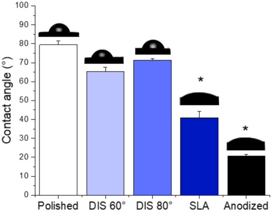 Determination of hydrophilicity/hydrophobicity of Ti samples by contact angle measurement. Mean + SE, N = 3 * p-values < 0.05 compared to polished, DIS 60° and DIS 80°.