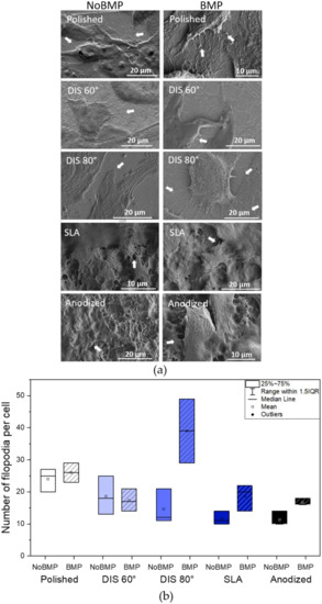 - DIS 80° nanocone-patterned surfaces in conjunction with BMP-2 increase almost 1.2-fold cell spreading and 2-fold vinculin expression, reaching values similar to polished samples with BMP-2. Moreover, we observed a 2.25-fold increase in the number of filopodia per cells (39 ± 20) in these surfaces compared to all surfaces with or without BMP-2, suggesting a synergistic effect in cell adhesion when we combine DIS 80° treatment with BMP-2.