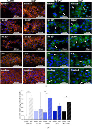 Due to the values observed on titanium surfaces regarding cellular adhesion structures (filopodia prolongations), we decided to evaluate the adhesion process by the immunostaining and quantification of vinculin protein expression. Vinculin protein participates in focal adhesion complexes and plays a fundamental role in cell-cell and cell-matrix interactions and regulates adhesion through binding, polymerizing and remodeling actin fibers [47,48]. Figure 6a shows the confocal images of C2C12 cells, in which vinculin proteins appeared in green, actin in red, and cell nuclei in blue color. Cell number and vinculin intensity from these images were quantified using FIJI software and the results were compiled in Figure 6b. We observed that the addition of BMP-2 increased vinculin expression on cells growing on polished (465%), DIS 80° (200%) and Anodized samples (110%) compared to the samples without BMP-2, although no statistical differences between DIS 80° with BMP-2 and polished BMP-2 were found.