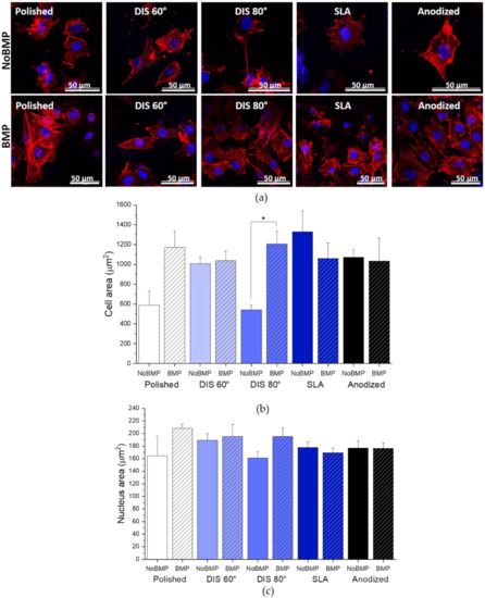 In addition, cell spreading was evaluated through the analysis of the confocal microphotographs (compiled in Figure 7). The cell cytoskeleton, which is composed of actin filaments, was measured to determine the area of the cell (Figure 7a). We observed that the presence of BMP-2 in cells growing on DIS 80° samples showed higher surface area, increasing cellular spreading by 120% compared to its counterpart without the protein, but no statistical differences were found compared to polished samples with BMP-2 (Figure 7b). Although we did not observe significant differences in nucleus area among the different samples, it seemed that the addition of BMP-2 increased the nucleus area of cells cultured on DIS 80° samples (Figure 7c).